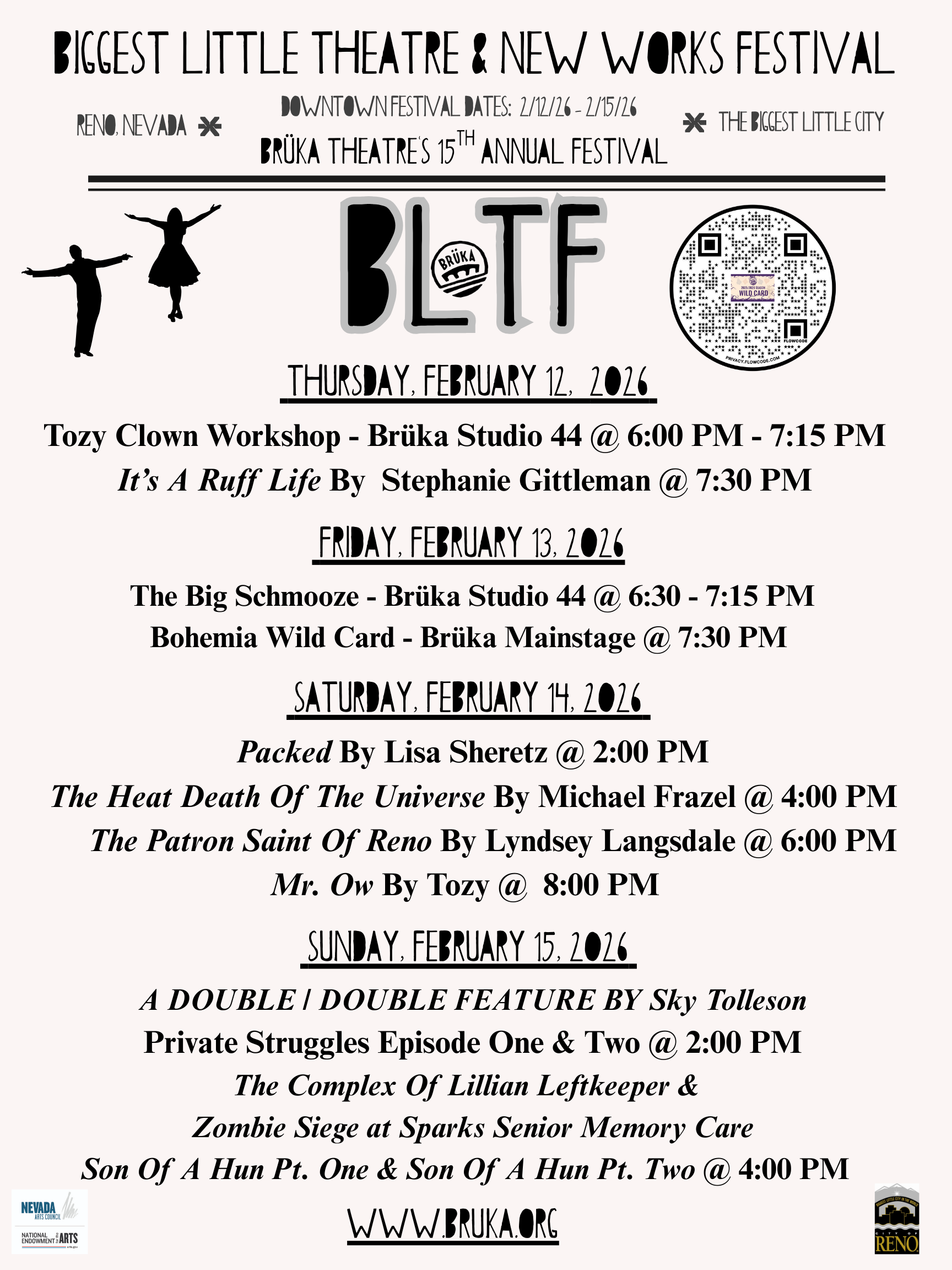 Brüka Theatre, founded in 1992, started as a children's theater, then added adult and family productions in 1996. Known for innovative shows and talented artists, Brüka, now on its 31st season, is part of the TCG and has been honored with many awards, like "Best Theatre Company," for twenty-one years. Over 2100 shows have been held at its Reno venue.