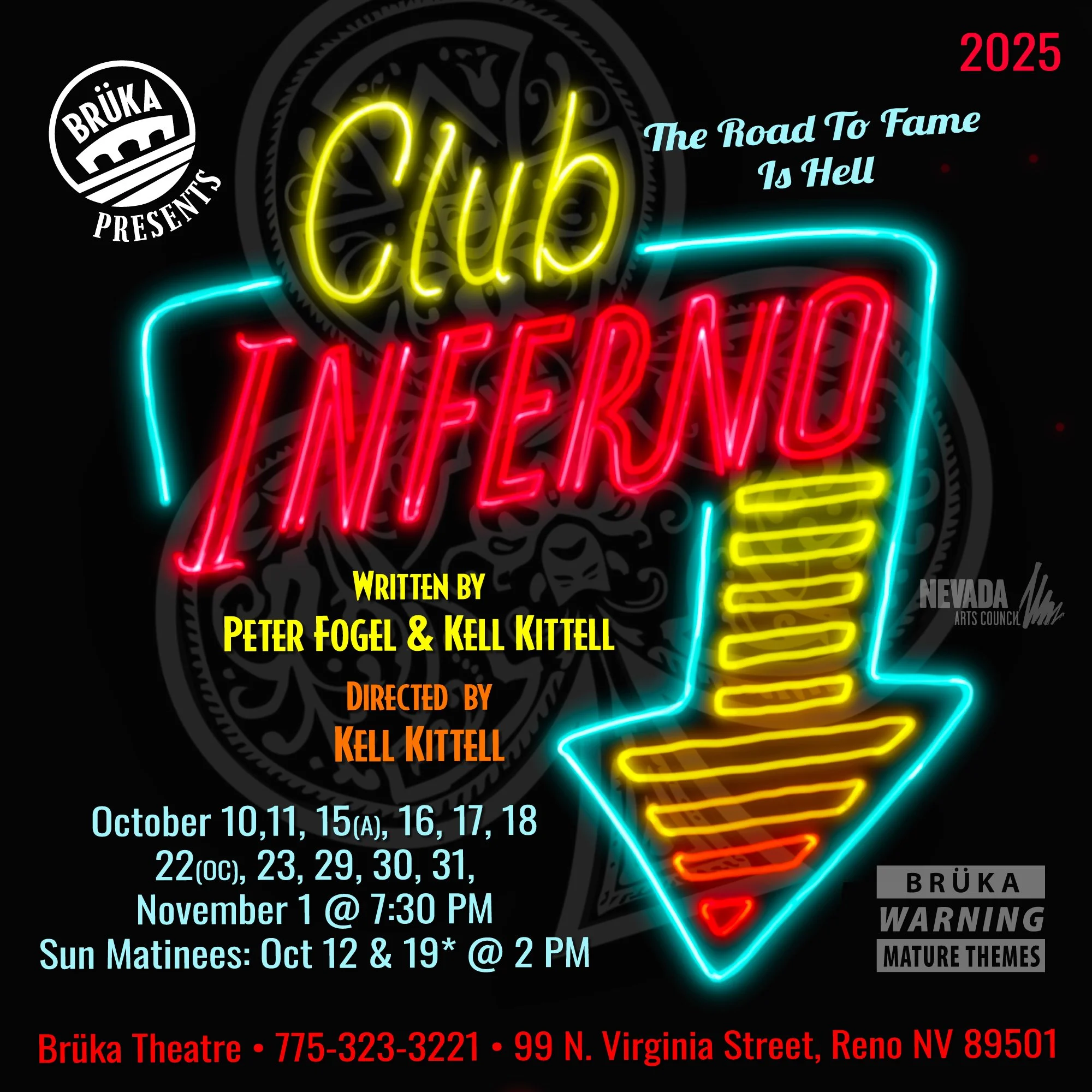 Opening 10/10/25 Brüka Theatre proudly announces the Reno premiere of Club Inferno, the electrifying, award-winning glam-rock musical created by Reno native Kell Kittell (book & lyrics) with music by Peter Fogel (music & lyrics). Originally a San Francisco cult sensation, Club Inferno blazes back with a reimagined production that fuses outrageous humor, high-voltage rock anthems, and dazzling theatrical spectacle.