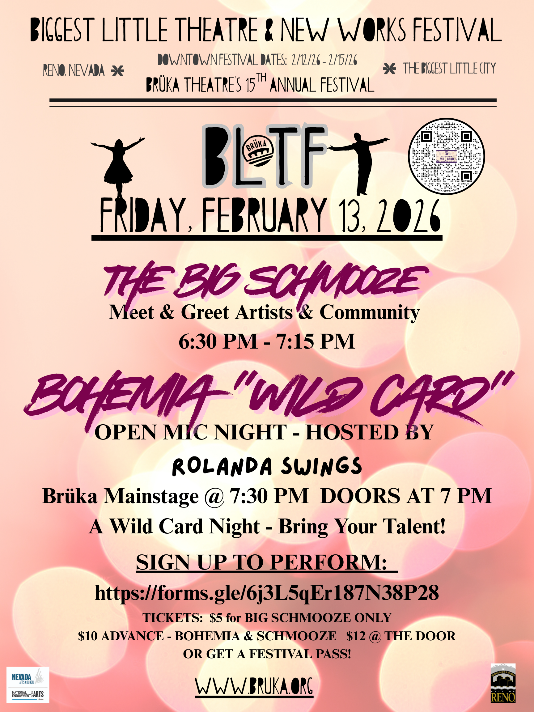 RENO, NV - The Fifteenth annual BIGGEST little Theatre & New Works Festival at Brüka Theatre is a showcase for original theatre pieces featuring traditional and nontraditional performances created by local and regional performance artists. Produced to support local theatre artists, giving an accessible, affordable and supportive environment to produce and take a chance with original work while also giving audiences the experience of locally produced original work in a theatre festival style. Aligning with Brüka Theatre’s Mission: To create and share the experience of innovative theatre, this small festival features performances on Brüka’s Mainstage and community events in Bruka’s Studio 44 space. Each performance varies in length or under and most followed by a talk back. Groups receive a portion of the ticket sales.
