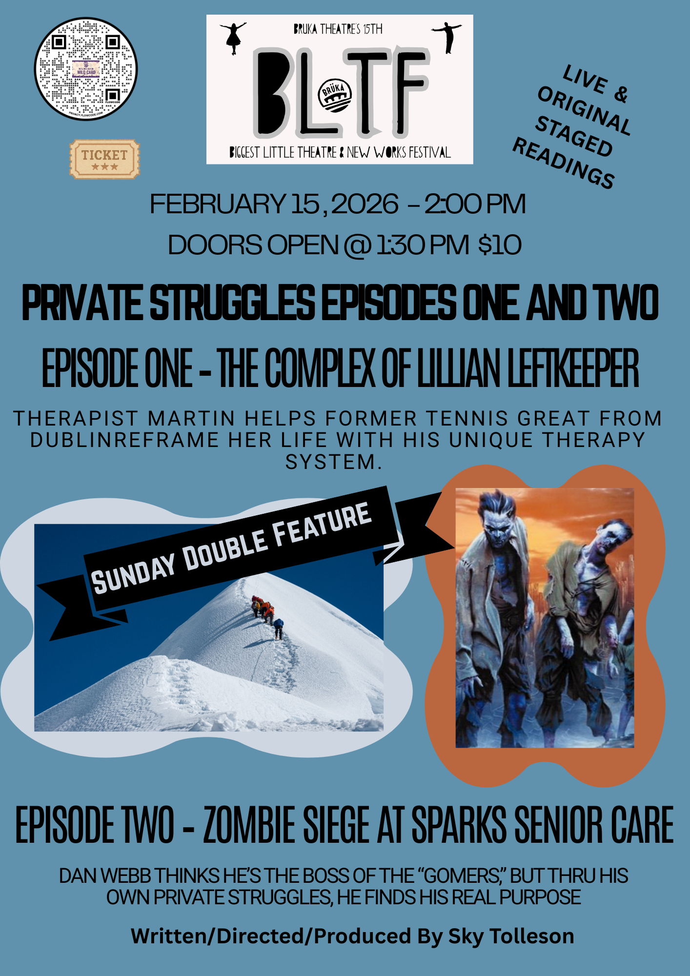 ABOUT THE FIRST DOUBLE FEATURE OF PLAYS: Private Struggles is A Twilight Zone style series of one acts plays. Lillian Leftkeeper - an eccentric woman's life is reframed by her therapist. Zombie Siege - A Cynical man's life is changed by a zombie siege at this workplace. Length: Two Acts running 20ish minutes each. Playreading. Adult comedy.
