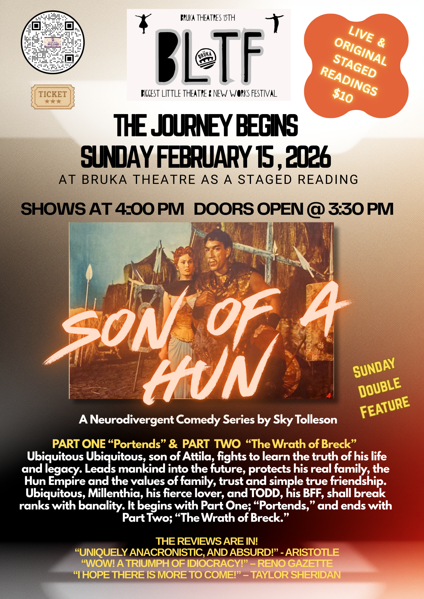 ABOUT THE RENO DOUBLE FEATURE OF PLAYS: A “Neurodivergent Comedy Series” also known as existential or absurd theatre. Time travelers journey through dimensions where things “bleed through” from other times and realities. 474 AD - Past Reno. Part One: “Portends” The fascinating true story of Attila, the Hun’s journey to Washoe Valley and his son, Breck’s search for truth. Part Two: “The Wrath Of Breck” - after discovering the lies of his family, Breck resets the scales of justice. Running Time: 2 Acts - 50 minutes each. Playreading. Adult comedy.